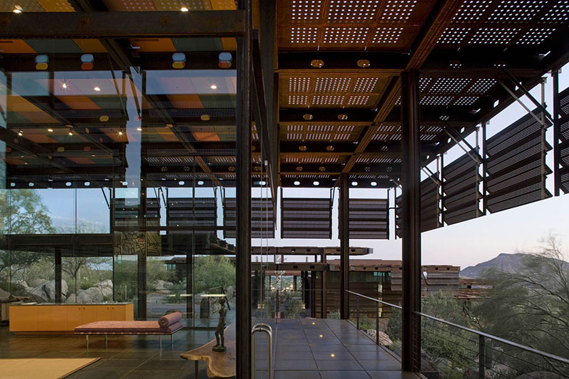 All structural and architectural components are manufactured out of Cor-Ten Steel, a type of steel with a chemical composition specifically engineered to ensure structural integrity by allowing it to form its own protective layer under the influence of weather. Commonly used on bridges to ensure structural integrity Cor-Ten steel becomes a dark brown / purple color with a smooth finish after sufficiently weathering.